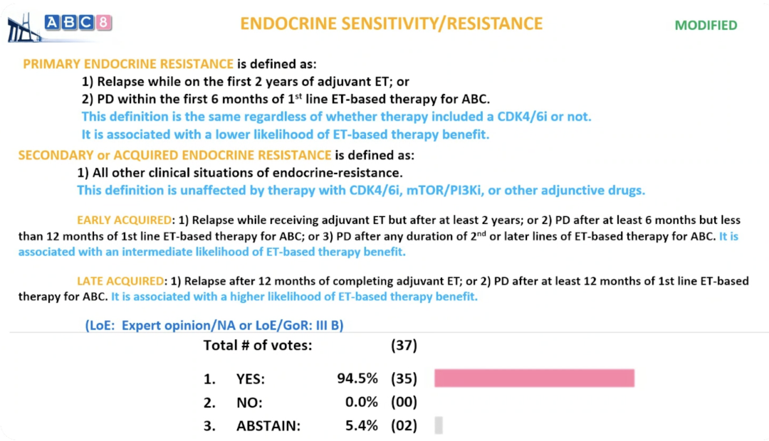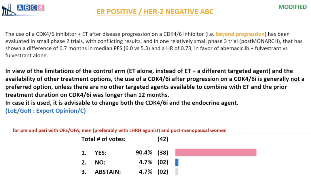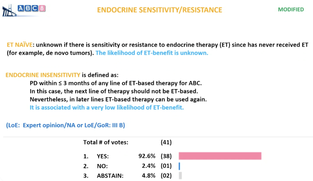 编者按:第八届晚期乳腺癌国际共识会议(ABC8)于当地时间2025年11月6~8日在葡萄牙里斯本举行。ABC共识指南是晚期乳腺癌领域首屈一指的国际性权威指南,汇聚了全球晚期乳腺癌领域的“意见领袖”级别专家,基于最新的循证医学证据对前沿和热议话题进行投票以达成共识,为全球晚期乳腺癌临床实践的革新和规范提供指导意见。肿瘤瞭望对ER+/HER2-晚期乳腺癌诊疗章节的专家意见和投票结果整理如下。