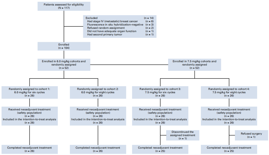 TQB2102-Ⅱ-01研究是一项在中国5家中心开展的开放标签、随机、Ⅱ期临床试验,旨在评估TQB2102在HER2阳性乳腺癌新辅助治疗阶段的抗肿瘤活性与安全性。研究纳入18至75岁、既往未接受过化疗的、经病理确诊为HER2阳性乳腺癌(免疫组化3+,或2+并经原位杂交证实扩增)患者。首先以1:1比例分配至6.0 mg/kg剂量治疗六周期(队列1)或八周期(队列2)的两组;在完成首阶段入组后,后续入组患者再按1:1比例分配至7.5 mg/kg剂量治疗六周期(队列3)或八周期(队列4)的两组。激素受体(HR)状态(阳性或阴性)作为唯一分层因素用于确保随机平衡。各组患者均按照方案接受TQB2102静脉给药,治疗持续至疾病进展、出现无法耐受的毒性、研究者判定不宜继续或患者主动退出。研究的主要终点为总病理完全缓解率(tpCR),定义为术后乳腺原发灶及区域淋巴结均无浸润性残余病变的比例;次要终点包括乳腺病灶的病理完全缓解率(bPCR)、ORR、无事件生存期(EFS)、无侵袭性疾病生存期(iDFS)、总生存期(OS)以及安全性。