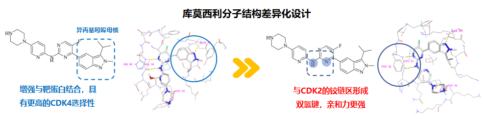 库莫西利作为全球首款CDK2/4/6抑制剂,在结构上进行了全面优化:其异丙基吲哚母核增强与靶蛋白结合作用,具有更高的CDK4选择性;还能与CDK2的铰链区形成双氢键,稳定发挥CDK2抑制作用。在同等试验条件下IC50 ratio:CDK6/CDK4为1.4,高于哌柏西利的0.2和阿贝西利的1.2,其高选择抑制CDK4、低选择抑制CDK6的特点较传统CDK4/6i更为突出,可在保持强效抗肿瘤效果的同时,降低骨髓抑制的发生。令人更加关注的是,库莫西利独特的CDK2抑制剂机制,将进一步克服传统CDK4/6i的耐药问题,为临床提供全新机制的治疗选择[10]