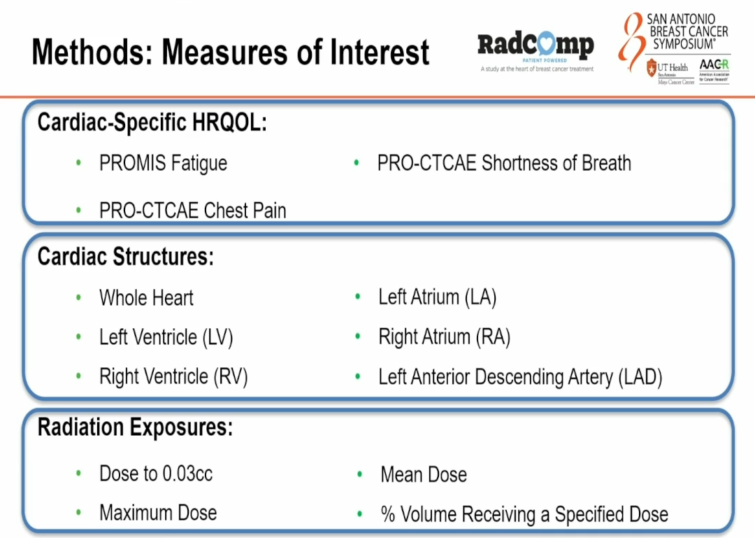 研究队列纳入RadComp试验中按方案完成治疗、具有完整心脏亚结构剂量体积数据、并在放疗前及放疗后6个月内至少完成一次心脏特异性HRQOL评估的局部晚期乳腺癌患者。心脏特异性HRQOL评估工具包括PROMIS疲劳量表、PRO-CTCAE呼吸困难以及PRO-CTCAE胸痛、胸部紧迫感和心绞痛。心脏亚结构剂量学分析包括全心、左心室、右心室、左心房、右心房及左前降支动脉。
