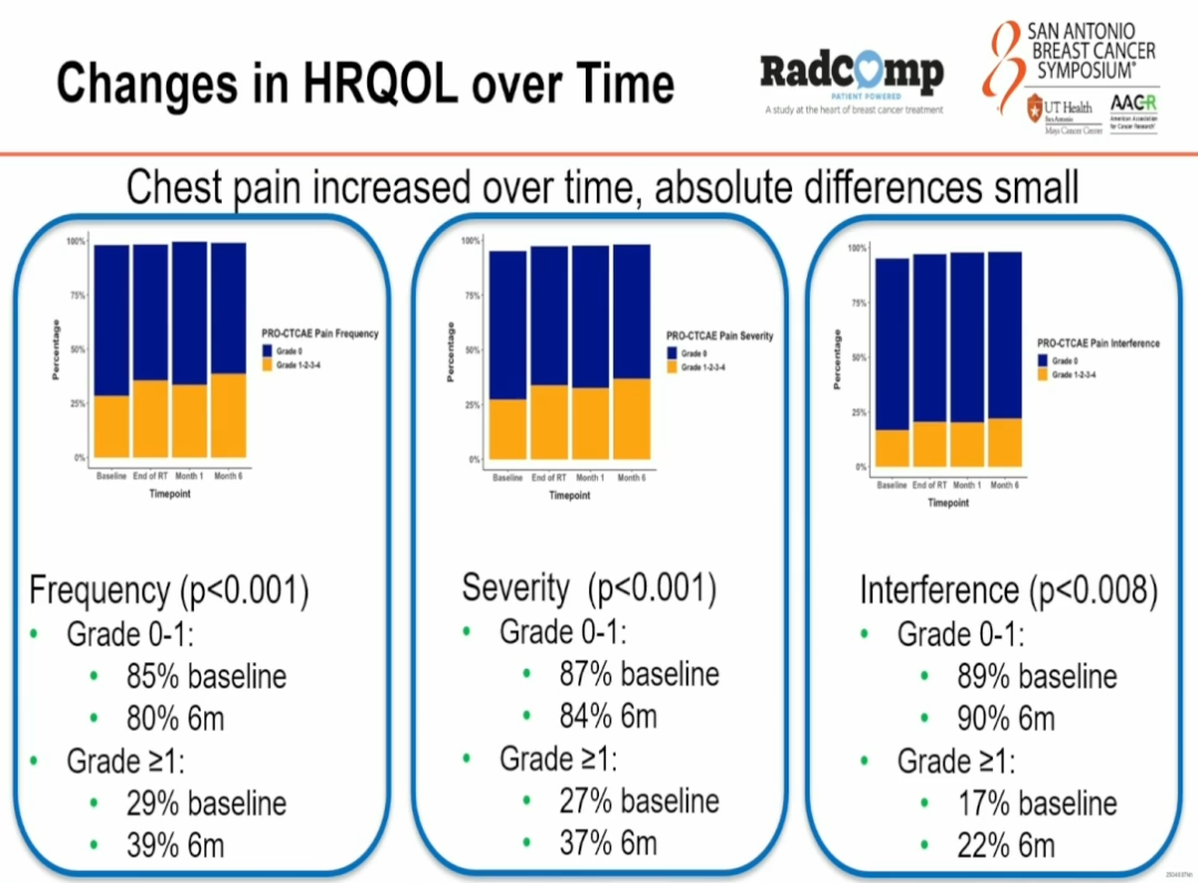 尽管PRO-CTCAE呼吸困难的严重程度(p=0.24)和对日常生活的干扰程度(p=0.11)随时间无显著变化,但胸痛的频率(p<0.001)、严重程度(p<0.001)及对日常生活的干扰程度(p=0.008)较放疗前有轻微加重。所有剂量体积参数均未与任何心脏特异性HRQOL结局呈现显著关联;按病变偏侧分层后结果一致。