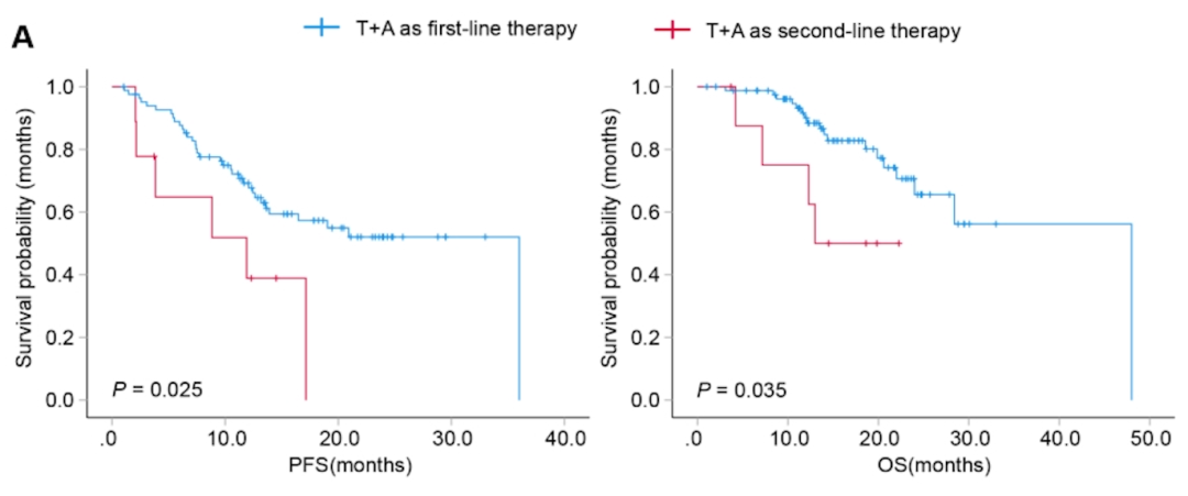 一线治疗也带来了显著的生存获益。一线治疗组的中位无进展生存期(mPFS)未达到,而二线治疗组为11.9个月(95%CI:1.34-22.46)(P=0.025)。尽管两组的中位总生存期(mOS)均未达到,但一线治疗与显著更优的总生存期相关(P=0.035)。