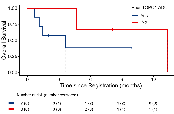 根据LANO标准,肿瘤缓解率为30%(n=3/10),包括2例ADC初治患者为部分缓解,1例ADC经治患者(既往接受过SG治疗)为完全缓解。中位随访时间为8.1个月,中位颅内PFS为4.1个月(95%CI:0.7~NR),中位OS为4.7个月(95%CI:0.7~NR)。与ADC经治患者相比,ADC初治患者(n=3)的颅内PFS(5.9 vs 1.4个月)和OS(13.3 vs 3.7个月)在数值上更长。
