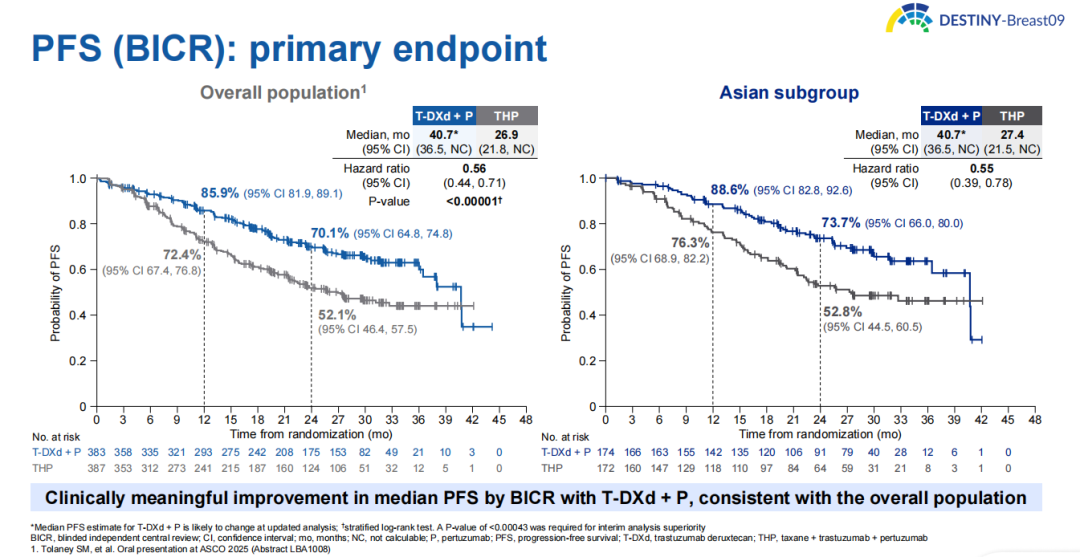 2025年ESMO ASIA年会上公布的亚洲患者的数据显示,截至2025年2月26日(中位随访30.2个月),T-DXd+P较THP显著延长BICR评估的PFS(中位40.7个月vs 27.4个月,HR 0.55;95%CI:0.39-0.78)。T-DXd+P和THP组24个月PFS率分别为73.7%和52.8%。治疗相关3级及以上不良事件(TEAE)发生率在T-DXd+P组和THP组分别为57.7%和67.3%。