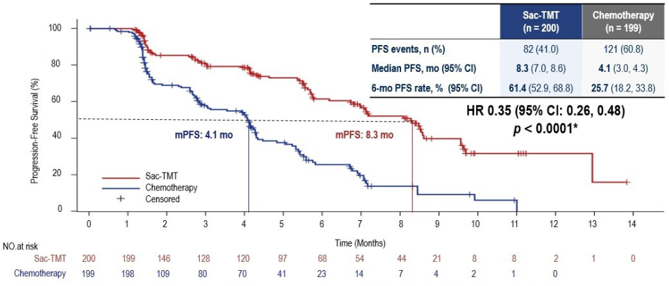 2025年,SKB264在HR+/HER2-晚期乳腺癌也取得了一定进展,但目前还未获批适应症。ESMO年会公布了SKB264的关键III期OptiTROP-Breast02研究。该研究纳入399例接受过1-4线化疗(约43%为1线化疗经治),且至少接受过1次CDK4/6i、内分泌治疗及紫杉类治疗的HR+/HER2-晚期乳腺癌患者,按1:1予以SKB264和ICC治疗。结果显示,SKB264较ICC显著延长BICR评估的mPFS,为8.3个月vs 4.1个月(HR 0.35;95%CI,0.26-0.48;P<0.0001)。OS尚不成熟。安全性方面,SKB264≥3级不良事件发生率与ICC类似(62.0%和64.8%),以血液学毒性、口腔黏膜炎最为常见,有1.5%的患者出现ILD,临床实践中需注意相关事件的管理[14]。