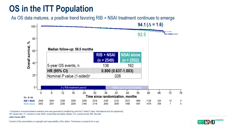 2025 ESMO最新5年随访数据显示[14],随着随访时间的延长,OS的HR值持续走低,从3年的0.89,4年的0.83,下降至5年的0.80,死亡风险降幅进一步扩大至20%(HR=0.80,95%CI:0.637-1.003,1-sided P=0.026),Kaplan-Meier曲线亦呈现分离的趋势[14、15]这恰好顺应了早期乳腺癌局部治疗的降阶趋势,深刻体现了全身治疗强化与局部治疗降级可并行不悖,共同优化治疗策略。