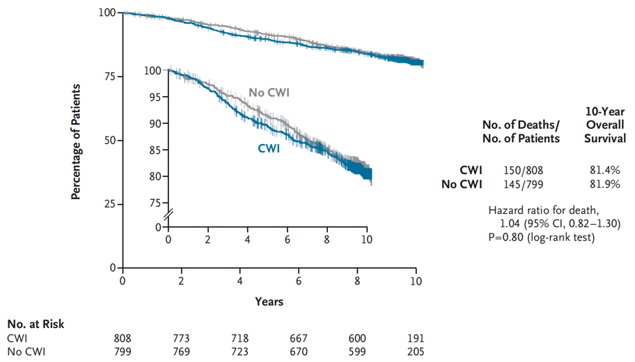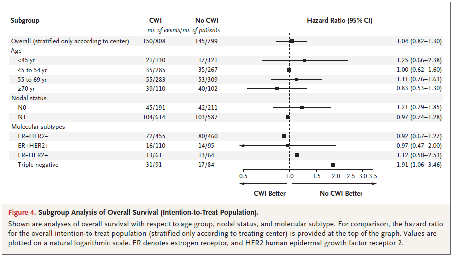 患者被1:1随机分为两组:胸壁放疗组(CWI,接受40-50 Gy照射15~25次)与无胸壁放疗组(no CWI)。主要研究终点为总生存期(OS);次要研究终点包括胸壁复发率(无论是否伴有其他部位复发)、局部区域复发率、无病生存期(DFS)、无远处转移生存期(DMFS)、死亡原因、短期及长期放疗相关不良事件、生命质量(QOL)和成本效益(CE)。