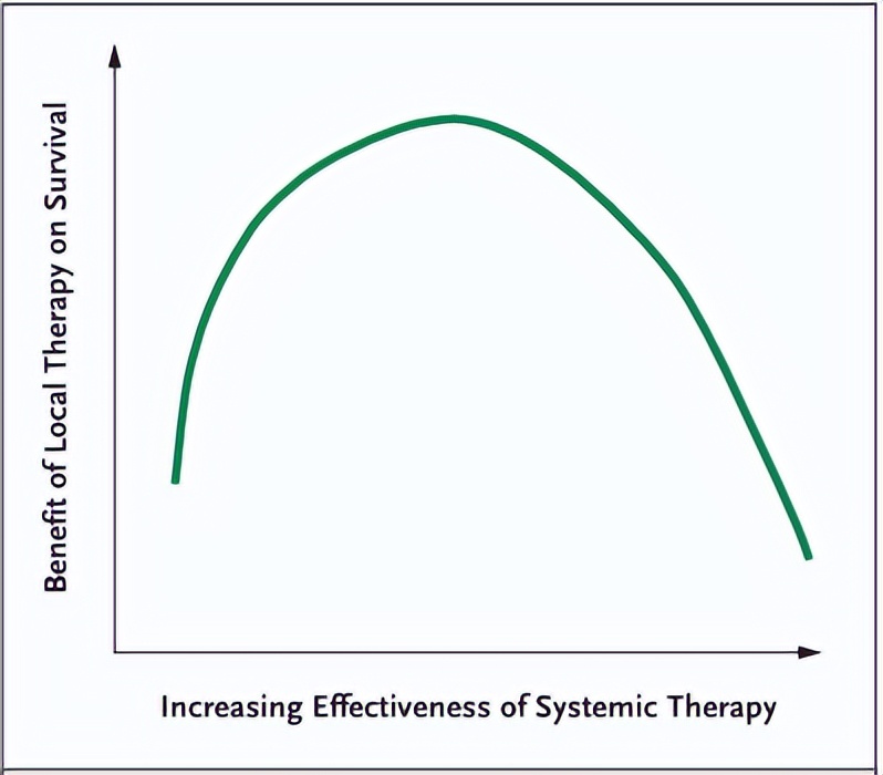 图3.全身性治疗效力日益增强下,局部肿瘤控制对生存的假设性获益[17]