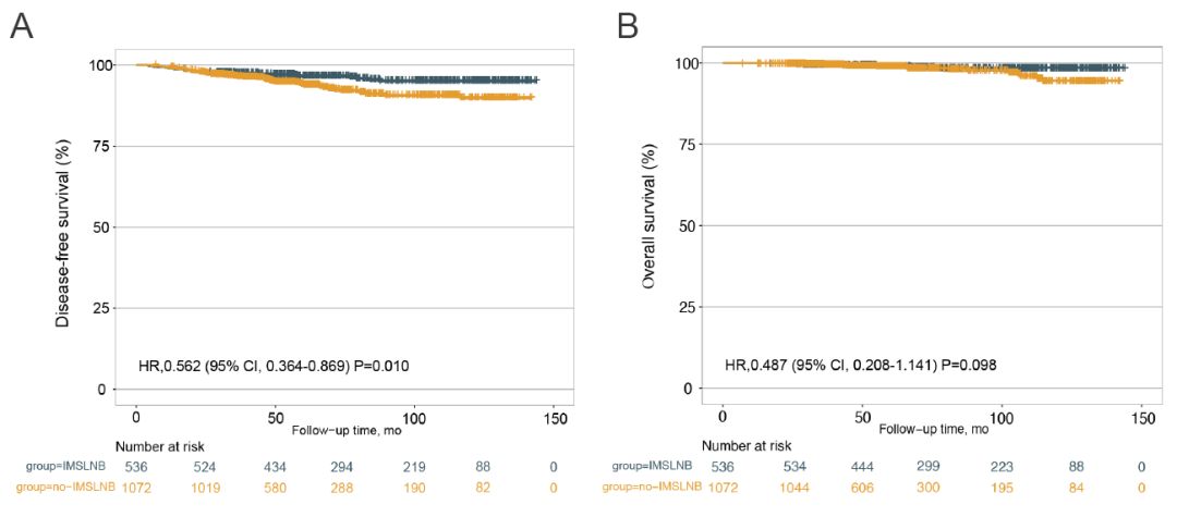 中位随访60.9个月后,IMSLNB组的5年DFS显著优于no-IMSLNB组(95.9%vs.93.9%;HR,0.562;95%CI:0.364–0.869;P=0.010),但5年OS差异无统计学意义(98.9%vs.98.5%;HR,0.487;95%CI:0.208–1.141;P=0.098)。IMSLNB组的5年RRFS(99.4%vs 98.4%,HR,0.360;95%CI:0.145-0.890;P=0.027)和LRFS(99.6%vs 98.5%,HR,0.380;95%CI:0.118-0.800;P=0.016)均显著优于no-IMSLNB组,但两组间的5年DMFS差异无统计学意义(96.8%vs 97.0%,HR,0.843;95%CI:0.472-1.508;P=0.565)。