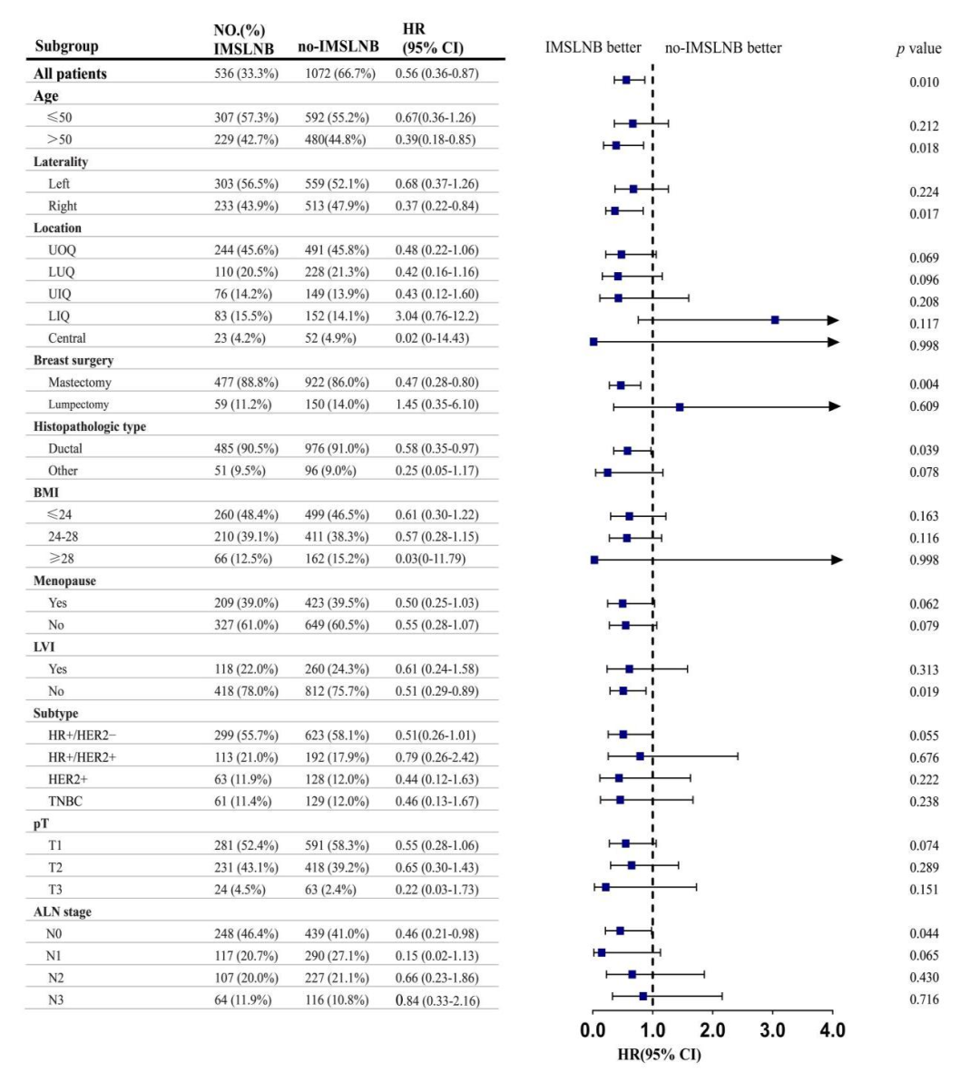DFS的探索性亚组分析显示,诊断年龄(≥50岁)、接受乳房切除术、淋巴血管侵犯(无)、病理类型(浸润性导管癌)和腋窝淋巴结(ALN)状态(阳性)各亚组患者可从IMSLNB显著获益(P<0.05)。