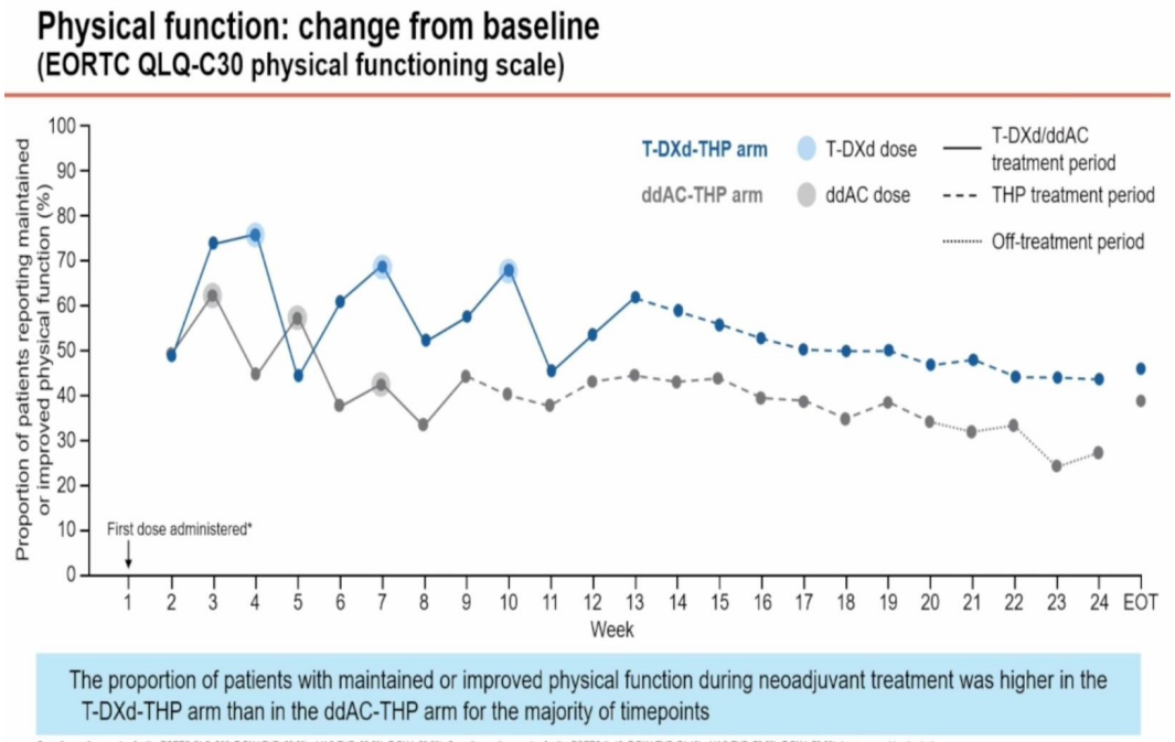 陈益定教授:我认为DB-11研究PROs数据是大会快速口头报告(摘要号RF6-06)中最重要的内容之一,研究以当前通用的EORTC-QLQ-C30量表对PROs进行评估,T-DXd-THP组患者报告身体功能维持或改善(43.7-75.7%vs.24.0-62.4%)、有症状性AEs得到改善的比例都高于ddAC-THP组,而认为新辅助治疗副作用严重困扰日常生活的患者占比较低(43.0%vs.49.5%),与此前报告T-DXd-THP组较好的安全性数据相符。