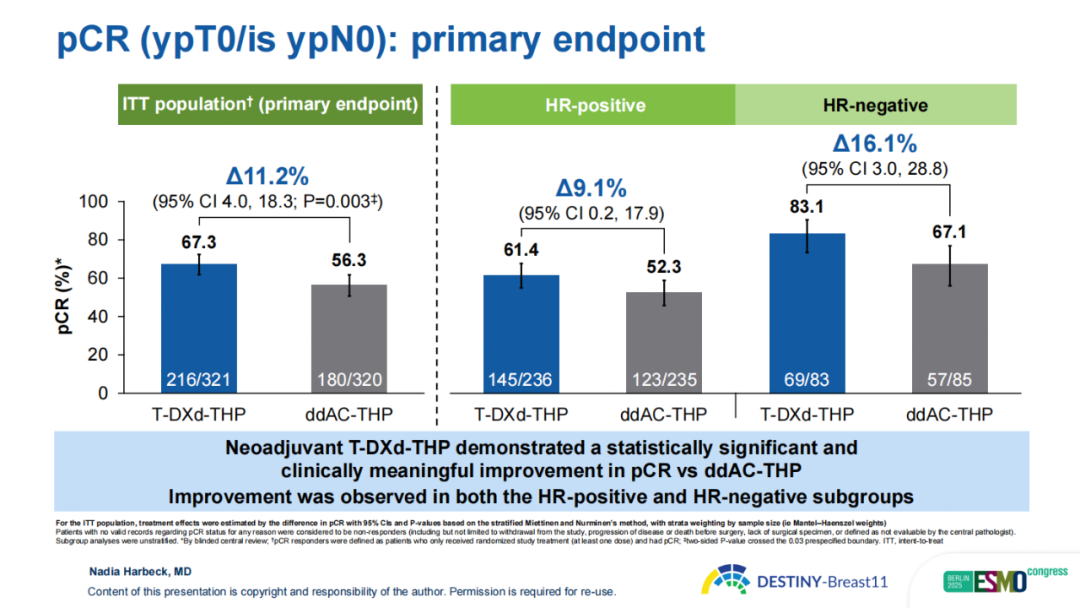 陈益定教授:登上ESMO年会主席专场(Presidential Symposium)的DB-11研究期中分析结果显示,在未经治疗的高风险HER2阳性早期乳腺癌患者中,T-DXd-THP新辅助治疗的pCR率为67.3%,相较ddAC-THP组的56.3%实现了11.2%的绝对值提升(P=0.003),且无论激素受体(HR)表达状态如何,T-DXd-THP组的pCR率均更高,在HR+患者亚组中为61.4%vs.52.3%,HR-患者亚组中为83.1%vs.67.1%,提示T-DXd-THP方案缩瘤疗效显著,可能助力更多可手术早期患者实现治愈。