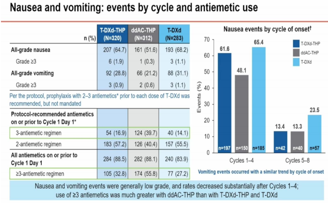 而在恶心/呕吐、周围神经病变方面,T-DXd-THP组发生率与对照组相似,且≥3级事件发生率均不足2%,且T-DXd-THP组需预防性使用≥3种止吐药物的比例也更低(32.8%vs.55.8%),因此相对较易管理。综合既往数据及最新公布数据,DB-11研究中T-Dxd-THP方案安全性与已知安全谱相似,且相较ddAC-THP方案有一定优势,属于可被患者耐受的新辅助治疗方案。