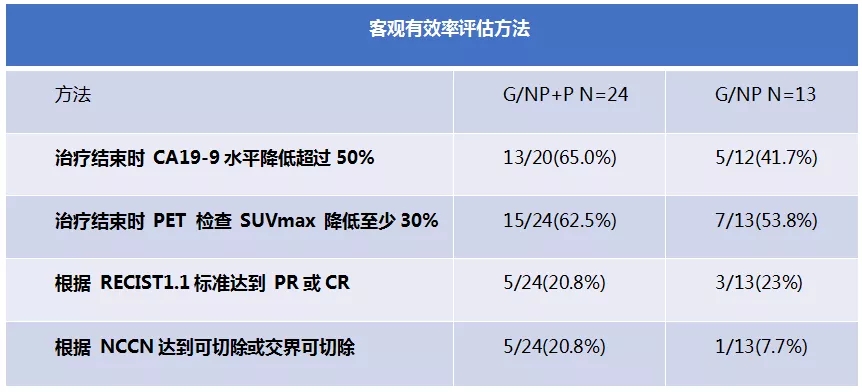 传统的胰腺癌疗效评估中肿瘤的客观有效率通过肿瘤退缩进行评估,在一项抗CTGF单抗pamrevlumab治疗局部晚期胰腺癌患者与吉西他滨/白蛋白结合型紫杉醇对可切除性和切除率的影响的Ⅱ期研究中,研究者提出了新的评估方法:a. 治疗结束时 CA19-9水平降低超过50%;b. 治疗结束时 PET 检查 SUVmax 降低至少30%;c. 根据 RECIST1.1标准达到 PR或CR;d. 根据 NCCN达到可切除或交界可切除。相较于传统的疗效评估方法,该方式提高了手术切除的可能性,为更多患者符合手术条件创造了更多机会,但仍需要在更大的患者群众进行验证。