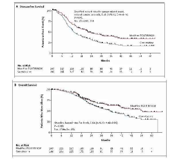 图3. mFOLFIRINOX 方案辅助治疗主要研究终点DFS和次要研究终点OS 提示疗效显著