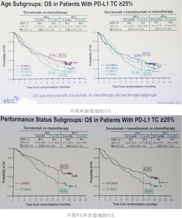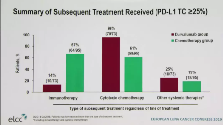 前期结果显示,尽管D组相较于CT组的OS在数值上有所改善,但并无统计学意义(16.3个月vs12.9个月,HR=0.76, 95% CI: 0.56-1.02,P=0.036),而双免疫治疗组(D+T)则在数值上差于CT组(11.9个月vs12.9个月)。2019欧洲肺癌大会(ELCC)则进一步公布了MYSTIC研究的另外几项亚组分析结果及后续治疗模式对OS结果的影响。