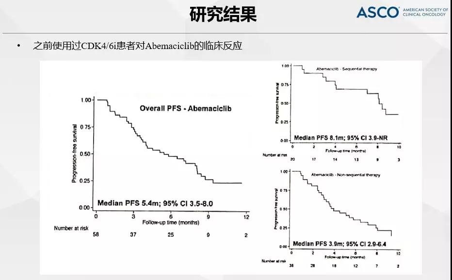 上述第一个研究(摘要号:1057)当中我们看到前线使用CDK4/6抑制剂Palbociclib出现进展,后线继续采用另外的一个CDK4/6抑制剂Abemaciclib。其中20例病人在Palbociclib进展以后直接后续就使用Abemaciclib,另外还有38例病人是进展之后后续使用了其他非CDK4/6抑制剂的治疗方案,然后再来使用Abemaciclib,我们可以看到总体的58例人群,他们的中位PFS还是不错的,有5.4个月。使用Palbociclib后进展,直接使用Abemaciclib的20例病人当中,可以看到他们的中位PFS非常好,有8.1个月,后线接受了其他治疗以后再接受Abemaciclib的病人,中位PFS只有3.9个月。有23例病人出现了原发耐药,在4个月以内就进展了,有11例病人目前仍在使用Abemaciclib中。所以这个研究给了我们一些提示,对于Palbociclib治疗进展以后使用其它的CDK4/6抑制剂Abemaciclib还是一个可以考虑的选择。