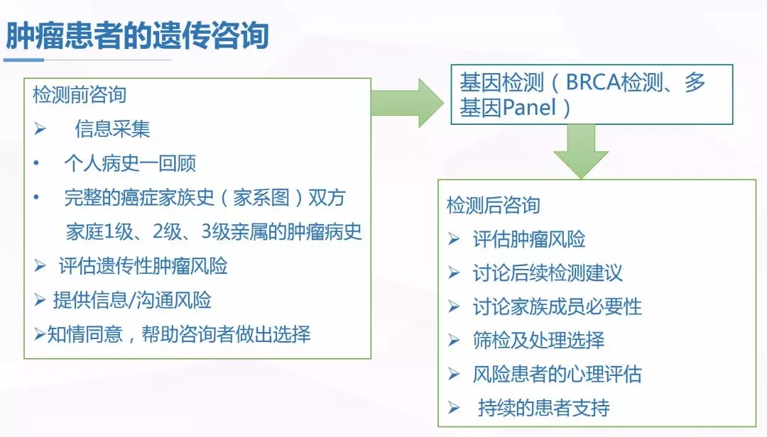 在朱莉·皮特于2013年公开自己携带了一个BRCA1基因的危险突变,并经历了预防性的双侧乳房切除术后,“朱莉效应——遗传咨询”开始进入大众视野。那么,什么是遗传咨询?科学的定义是用恰当的方式向咨询对象及其家属普及肿瘤风险相关的知识,为其选择遗传学及其他检测提供准确的信息,帮助正确理解和接受检测结果的过程。