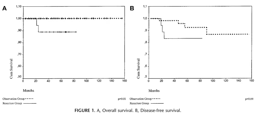 图1. 该研究显示,观察等待组的DFS和OS并不劣于根治手术组