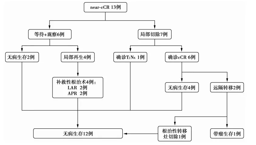 图4. 放化疗后评效为near-cCR患者的13例患者的治疗及转归
