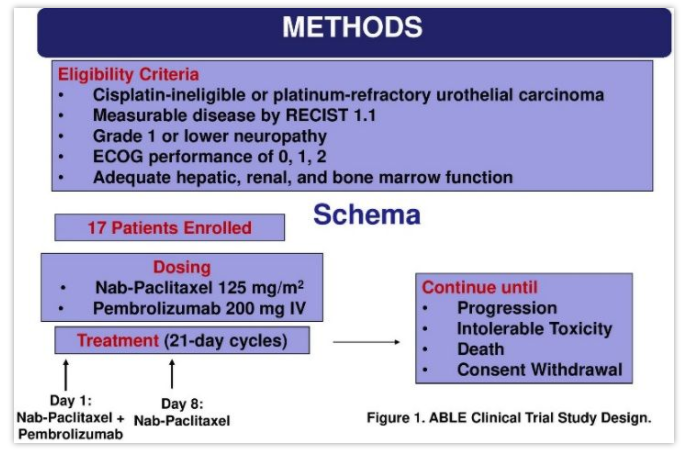 背景:PD-1免疫检查点抑制剂单药是PD-L1阳性、不适合含顺铂化疗的晚期UC患者的一线治疗方案。白蛋白结合型紫杉醇(Abraxane)单药治疗铂类难治性晚期UC的客观缓解率(ORR)为27.7%。ABLE试验将白蛋白紫杉醇+帕博利珠单抗联合方案用于铂类难治性或顺铂不耐受的晚期UC患者 (NCT03240016)。