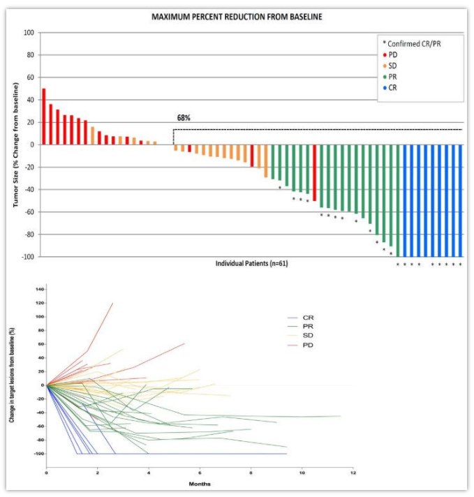 14例患者出现肿瘤缩小,9例患者达到ORR(56.25%; 95% CI[30-80%]);2例患者CR, 7例患者有部分缓解(PR),经过中位5.1 个月的随访,中位DOR为18周(95% CI: 6-NR),中位PFS为5.4个月(95% CI: 3.9-5.7),中位OS为15.2个月(95% CI: 5.5-18.2)。患者接受中位6个周期(范围1-11)治疗,中位DOT 为4.4个月(0.7-7.6)。