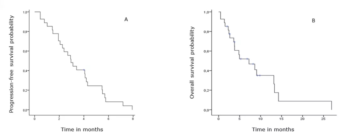 来自法国的研究则采用了烷化剂—给予患者达卡巴嗪或替莫唑胺为基础的二线化疗方案, 无进展生存期(PFS)和总生存期(OS)分别只有3.0个月和7.2个月(图3),研究也证实该方案可使一半患者出现短暂的临床治疗缓解和/或三分之一的患者出现形态学缓解(图4)[2]。本届ENETS年会发布的部分研究探讨了铂类为基础的二线化疗方案,但是样本量都比较小。