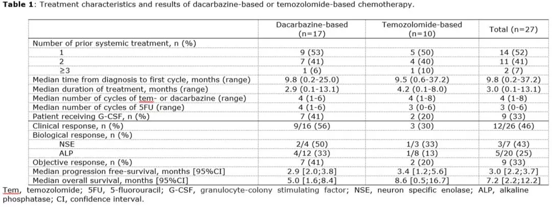 图4. 达卡巴嗪或替莫唑胺为基础的二线化疗方案的治疗反应