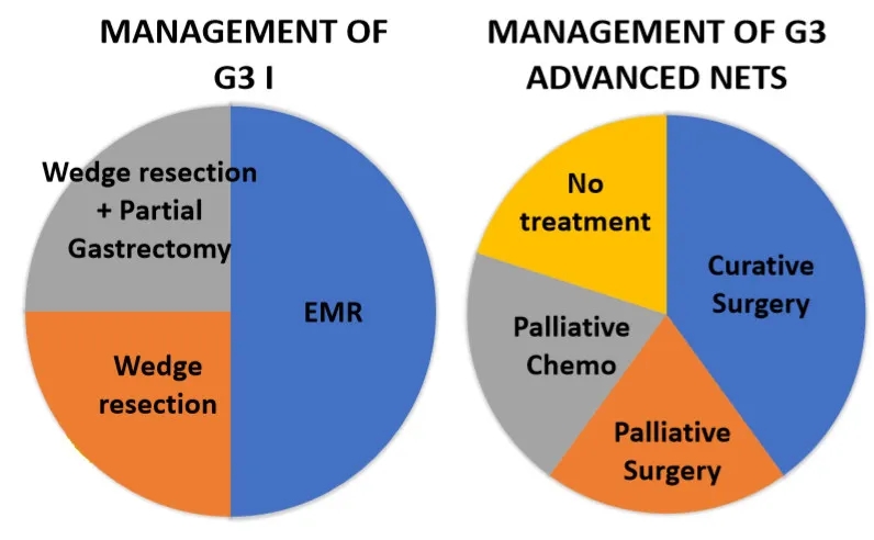 第二项是一项多中心的回顾性研究,主要探讨III型胃神经内分泌肿瘤的手术范围,该研究共收集了45例G1-G2级患者,主要手术方式包括内镜切除(EMR/ESD)、楔形手术切除(WR)和全胃或胃大部切除( Sub/total gastrectomy),部分患者未经手术治疗,主要是随访和药物治疗。这项研究得出的主要结论是,对于直径<2cm且ki-67指数<10%的III型患者,胃镜下切除或楔状切除似乎是足够的治疗方式(图4),但仍需要更多的研究去确认适合内镜切除的患者,以及淋巴结或远端转移的相关风险因素[4]。