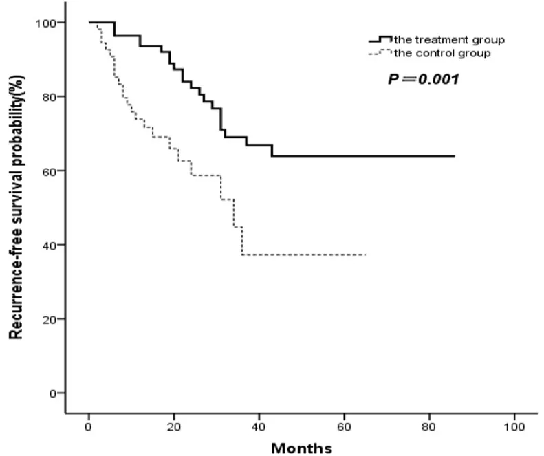 第三篇摘要来自中日友好医院的谭煌英教授团队,研究者在国内4个中心开展回顾性和前瞻性研究,一共纳入136例I型胃神经内分泌肿瘤患者,其中治疗组82例和对照组54例,治疗组采用煎煮中药(SMLJ01)。主要研究目的是探讨该中药的临床疗效,是否能降低内镜下切除后的复发率。总体上,该中药降低了复发率(HR=0.37),延长无复发生存期(RFS)(图5)。当然,这项研究也还需要更大样本的前瞻性研究去验证[5]。