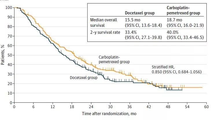 这是一项开放标签的III期临床研究。入组年龄大于75岁的局部晚期或转移性非鳞非小细胞肺癌患者;既往未接受过细胞毒类药物治疗;携带驱动基因突变的患者,需接受过相应的靶向治疗,PS评分0-1分。符合入组标准的患者按照1:1的比例随机分为联合治疗组(培美曲塞500mg/m2联合卡铂AUC=5,第1天用药,每周一次,4周期后接受培美曲塞维持治疗)或接受多西他赛单药治疗(60 mg/m2,第1天用药,每3周一次)。该研究为非劣效研究,假设联合和单药治疗的OS分别为18个月和15个月,即HR的95%可信区间上限不超过1.154。
