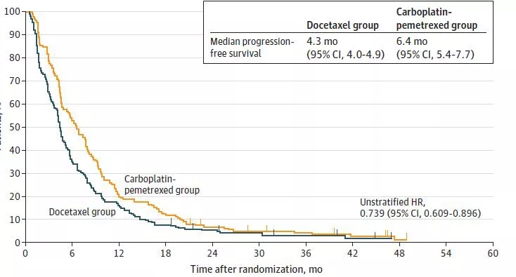 由于培美曲塞具有更好的安全性,既往一项II期临床研究发现,在年龄大于75岁的患者中,培美曲塞联合铂类双药化疗,患者的PFS和OS分别为5.7个月和20.5个月。本研究旨在通过一项随机对照研究,分析培美曲塞联合铂类双药化疗较多西他赛的疗效及安全性。