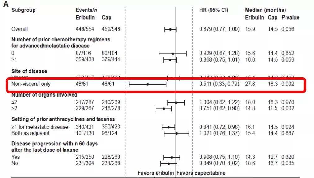 STUDY-301研究是对比艾立布林与卡培他滨的3期试验,入组患者为局部进展或转移性乳腺癌、至少经过蒽环及紫杉烷治疗(晚期为≤2线化疗)的乳腺癌患者(n=1102)。初次分析[2]显示在总体人群,艾立布林的生存获益可与卡培他滨相媲美。但随后的几次亚组分析[3,4]显示,相较于卡培他滨,艾立布林可显著延长TNBC亚组的中位OS达5个月(14.4 vs 9.4个月,HR0.702,P=0.006)、延长HER2阴性人群中位OS 2.6个月(16.1 vs 13.5个月,HR 0.77,P=0.026);且两组患者的总体TEAE无显著差异(94.0% vs 91.7%),而艾立布林的手足综合征发生率远低于卡培他滨(0.5% vs 48.3%)。非内脏转移分层分析显示,艾立布林比卡培他滨OS显著延长达9.5个月( 27.8m 对比18.3m ),死亡风险降低49%。