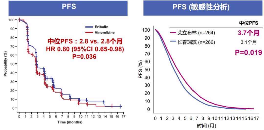 STUDY-304研究则是由中国学者领导的另一项对比艾立布林与长春瑞滨的Ⅲ期试验,入组患者为既往2-5次化疗的局部复发或转移性乳腺癌(n=530),2019年发表于《欧洲癌症杂志》(EJC)的初次分析[5]显示达到了主要终点,相较于长春瑞滨,艾立布林可显著延长患者PFS(2.8 vs 2.8个月,HR 0.80,95%CI 0.65-0.98,P=0.036;敏感性分析为3.7 vs 3.1个月,P=0.019)。