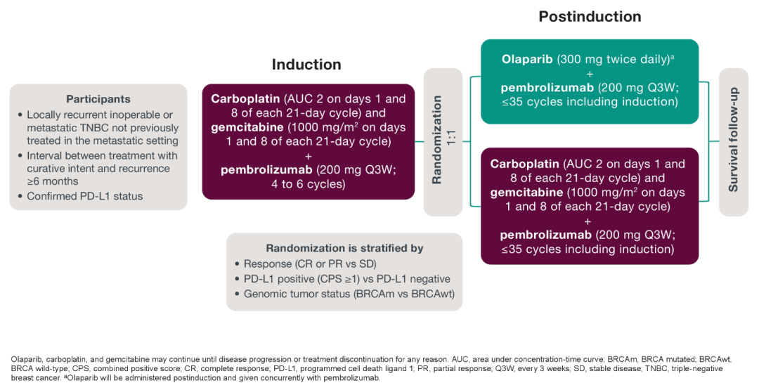 KEYLYNK-009研究(TPS 596)对晚期三阴性乳腺癌患者,在帕博利珠单抗+化疗一线治疗后的维持阶段,是使用帕博利珠单抗联合奥拉帕利还是化疗进行了探索。本研究分为II期(n=317)与III期(n=615),患者帕博利珠单抗+卡铂+吉西他滨诱导化疗后,再按1:1分组应用帕博利珠单抗联合奥拉帕利或者化疗进行维持治疗,主要终点为PFS和OS,次要终点为BRCA突变人群的PFS和OS,以及患者生存质量及安全性,目前该研究仍在入组中。