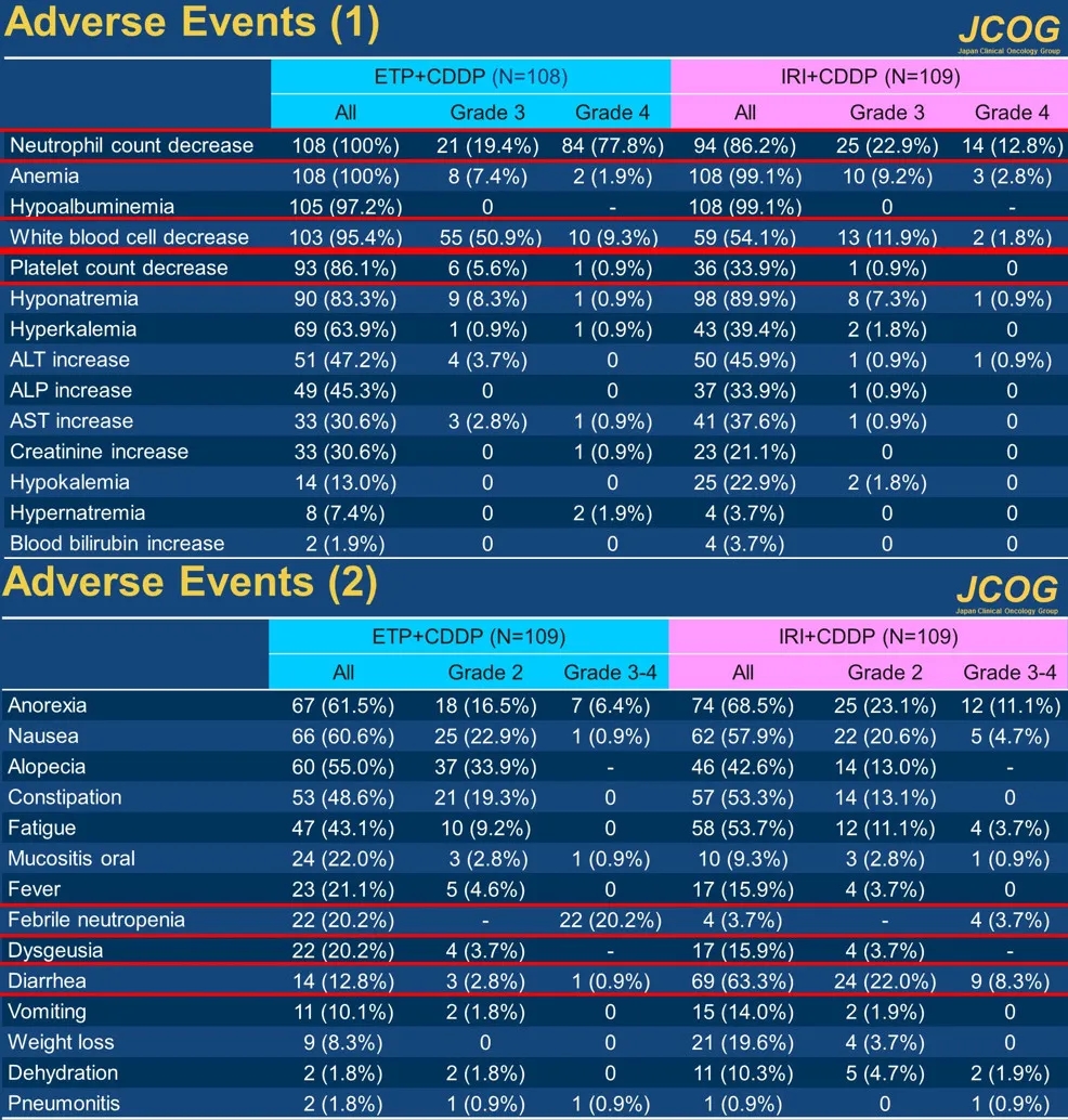 在不良反应方面,3级或4级发热性中性粒细胞减少症(20.2/3.7%)或中性粒细胞减少症(97.2/35.8%)的发生率(EP/IP)在EP中更为常见。3级或4级腹泻(0.9/8.3%)或厌食症(6.4/11.1%)在IP治疗组中更为常见。在IP治疗组中观察到一例治疗相关的气管出血死亡。