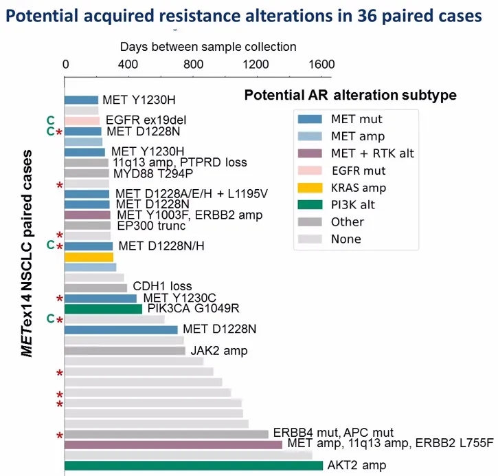 36 例患者提供了配对样本,在第二份样本中检测到32名患者的MET 14外显子跳跃突变。22/36例(61%)患者的二次标本存在获得性改变。其中,9 例(25%)具有 ≥ 1 种获得性 MET 突变 [D1228X (4)、Y1230X (3)、Y1003F (1)、D1228A/E/H + L1195V (1)] ,3 例(8%)患者存在获得性 MET 扩增(图5)。其他获得性改变包括 ERBB2 扩增和突变、EGFR ex19 插入、KRAS 扩增、PIK3CA 突变、AKT2 扩增以及其他功能意义不明的基因改变。