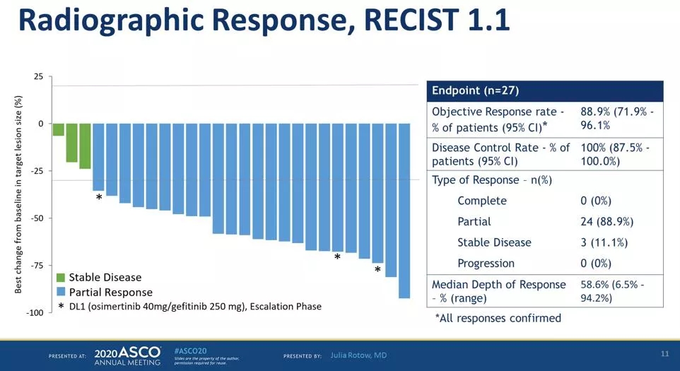 这项I/II期临床研究包括剂量爬坡和队列扩展两部分,纳入携带19del或21L858R突变的晚期NSCLC患者,基于I期剂量爬坡推荐的吉非替尼和奥希替尼的治疗剂量均为两款药物的全剂量。81.5%的患者完成了超过6周期的治疗,ORR为88.9%,最常见的治疗相关不良反应的发生率(任何级别/≥3度)分别为皮疹(96.3%/3.7%),腹泻(85.2%/11.1%)及皮肤干燥(70.4%/0%)。68%的患者基于ddPCR技术可以检测到外周血中的EGFR基因突变,82.4%的患者治疗2周后突变被清除。
