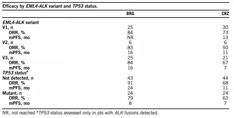 这项研究基于入组时的外周血进行分析,Brigatinib组和克唑替尼组分别有124例和127例患者取得外周血进行基因检测,两组ALK融合阳性率分别为52%和54%,其中与EML4融合为最常见的类型,占比分别为83%和93%,V1、V2和V3突变亚型在Brigatinib和克唑替尼组分别为V1:42%/47%;V2:16%/20%;V3:42%/33%。Brigatinib疗效不受突变类型及共突变的影响。V1型中,两组的ORR分别为84%和73%,PFS分别为未达到和13个月;V2型ORR分别为83%和50%,PFS分别为16个月和11个月;V3型分别为84%和67%,PFS分别为16个月和7个月;不合并P53共突变的患者,ORR分别为91%和68%,PFS分别为24个月和11个月;合并共突变的患者ORR分别为79%和63%,PFS分别为8个月和7个月。