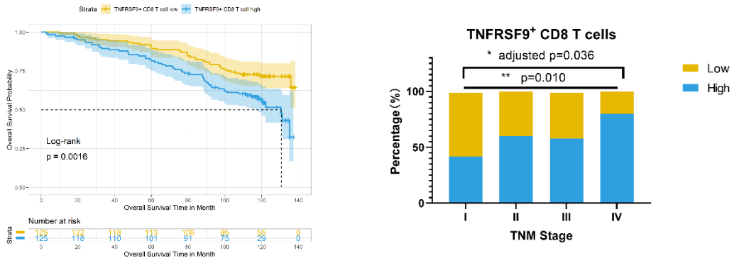 在该项研究中,研究者首先通过分析公共数据库(TCGA-KIRC)数据发现,TNFRSF9基因的表达与多种效应分子及免疫检查点分子的表达相关,且与CD8A分子显著相关。随后研究者在临床组织样本中进行免疫组化及免疫荧光实验,确认了TNFRSF9与CD8A的共表达,提示肾癌组织中存在TNFRSF9+ CD8+ T 细胞亚群浸润。研究者进一步分析发现,这群细胞的高浸润与未经系统治疗的肾癌患者的不良预后及更高的疾病分期有关。同时,作者在TCGA-KIRC数据库中也观察到了类似结果,提示这群细胞的浸润在肾癌发生发展过程中存在动态变化及其预后价值。