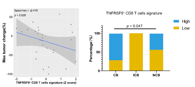 随后研究者通过流式细胞术检测了这群细胞的免疫功能状态,发现相比于TNFRSF9- CD8+ T 细胞,TNFRSF9+ CD8+ T 细胞高表达PD-1、CTLA4、TIGIT和TIM3等检查点分子,同时也高表达IFN-γ、GZMB等效应分子,提示这群细胞是具有一定功能的肿瘤浸润CD8+ T 细胞。鉴于此,研究者推测,这群细胞可能对目前临床常用的PD-1单克隆抗体的免疫治疗具有较高的反应性。研究者通过分析转移性肾癌免疫治疗的公共数据库发现,TNFRSF9- CD8+ T 细胞signature与免疫治疗过程中肿瘤体积缩小具有相关性,提示这群细胞可能在免疫治疗反应中扮演重要角色。