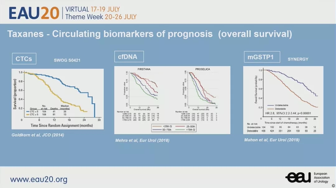 SWOG S0421研究证实基线CTC≥5个的mCRPC患者疾病进展风险是CTC<5个患者的2.92倍(P<0.001)[3],提示CTC对mCRPC患者多西他赛化疗疗效有预测价值。FIRSTANA研究和PROSELICA研究中,无论是在一线还是二线应用多西他赛/卡巴他赛,如cfDNA浓度越高,生存预后越差[4]。SYNERGY研究在应用多西他赛的mCRPC患者中,mGSTP1与OS显著相关,如能检测到mGSTP1预示OS短[5]。(图3)