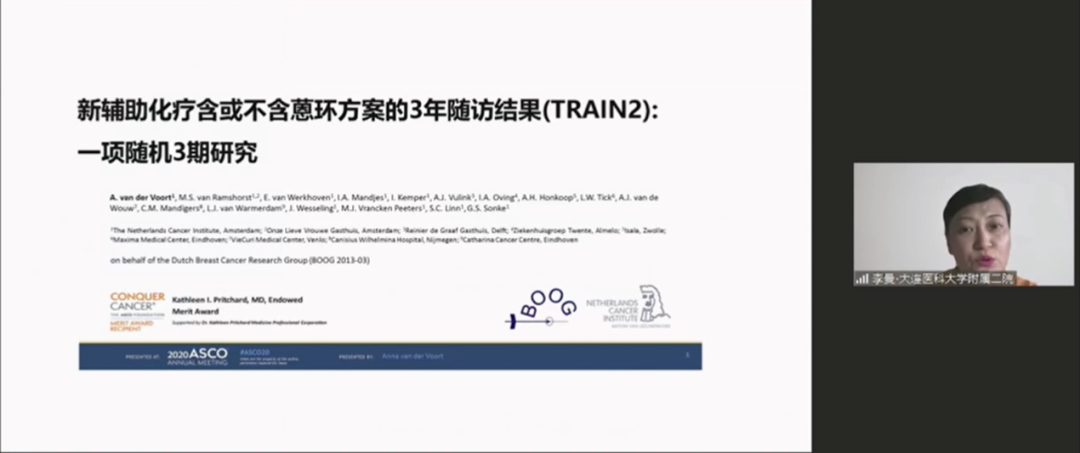 河北医科大学第四医院的马力教授分享了2020ASCO新辅助进展相关内容。从三种分子分型出发着重介绍了ASCO最新报道的TRAIN-2、WSG-TP-II和FELINE研究。纵观三项临床研究,不难看出其共同特点都是试图对化疗做降阶选择,TRAIN-2研究的3年随访结果提示在II期和III期HER2阳性乳腺癌患者中含蒽环类方案并未使EFS和OS受益;WSG-TP-II研究是首个HR+/HER2+早期乳腺癌的减化疗的新辅助随机对照研究;而FELINE研究则是在新辅助平台中试图找到一部分对新型内分泌治疗(AI+CDK4/6i)及其敏感的人群。随着靶向治疗与内分泌治疗方法百花齐放、日趋成熟,化疗的权重似乎将越来越低。
