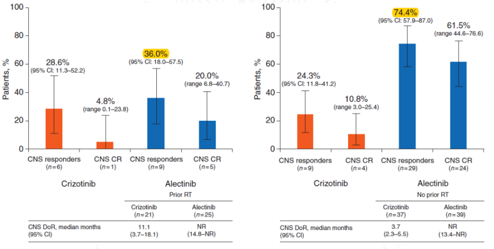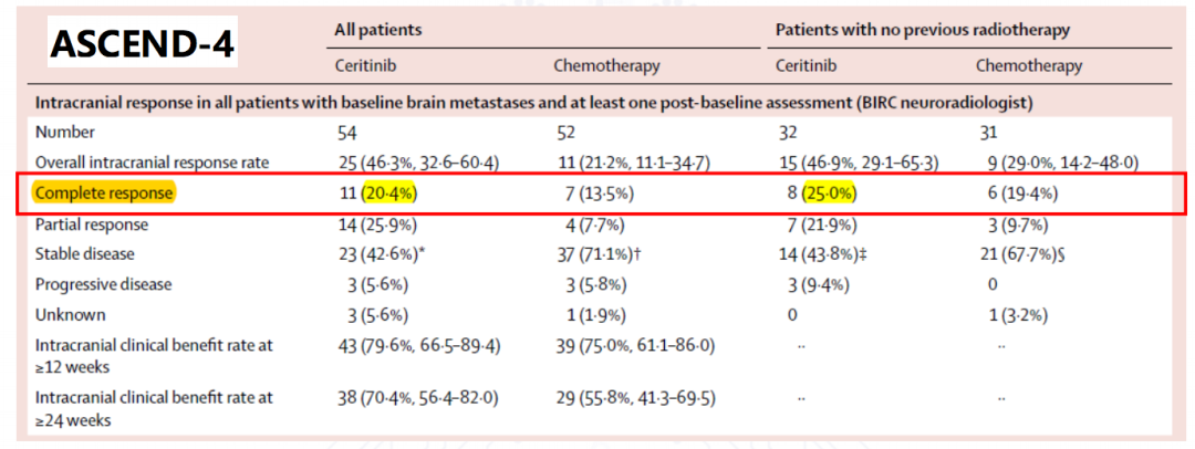 同为二代ALK抑制剂,塞瑞替尼和阿来替尼的临床研究中脑转移人群基线差异巨大,所以研究结果无法直接比较。ASCEND-4研究的脑转移人群中,高达60%为有症状/进展期脑转移;而在ALEX研究中,入组的均为稳定期(≥2周)、无症状的脑转移患者。值得注意的是,ASCEND-4研究中,60%的脑转移患者有症状,但颅内完全缓解率(CR)达20.4%,前期无放疗的患者中,颅内CR率高达25%!实属不易。