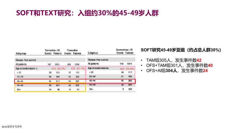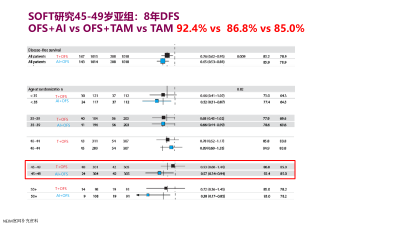 SOFT和TEXT研究入组了约30%的40-45岁人群,发现 45-50岁亚组卵巢抑制联合芳香化酶抑制剂*对比单独的他莫昔芬,8年DFS 92.4% vs 85.0%,可以看到7.4%的绝对获益,这是非常大的一个获益。虽然这部分患者卵巢功能已经衰退,卵巢抑制本身虽然还是有获益,但单独获益还是有限(86.8% vs 85.0%,绝对获益1.8%),但因为卵巢抑制可以确保患者变为绝经后状态,这时可以放心联合芳香化酶抑制剂,享受了芳香化酶抑制剂治疗相比他莫昔芬的DFS获益。所以对于40-45岁人群,虽然卵巢功能已经衰退,依然可能从卵巢抑制中获益,中高危患者有必要进行卵巢抑制联合芳香化酶抑制剂治疗。