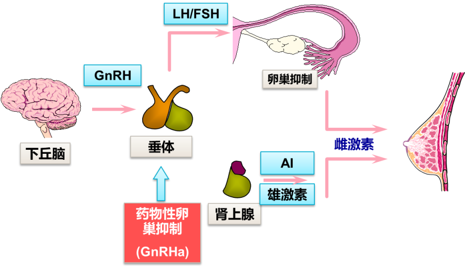 卵巢功能抑制是一把双刃剑,一方面,通过负反馈作用于垂体,抑制促黄体生成素产生,使雌激素水平下降,从而抑制肿瘤生长。另一方面,OFS降低血清中卵泡刺激素的表达,使卵巢内的血流量减少,降低化疗药物对卵巢内部结构的损伤,亦有研究表明OFS能够直接保护原始卵泡,因此对卵巢具有一定的保护作用。由此,OFS的双重机制决定了其在绝经前人群的重要作用。