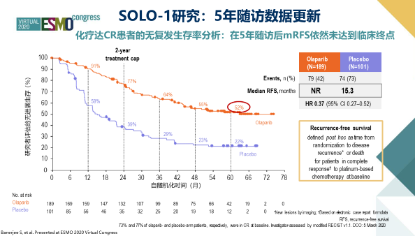 9月18日,2020年ESMO大会上,英国皇家马斯登癌症中心的Susana Banerjee教授报告了SOLO1研究更新数据[3]。患者接受奥拉帕利(n=260)或安慰剂(n=131)的中位持续治疗时间分别为24.6个月和13.9个月,中位随访时间分别为4.8年和5年,奥拉帕利组的PFS可较安慰剂组显著延长(56.0 vs 13.8个月,HR=0.33,95%CI:0.25~0.43)。对于基线达到完全缓解(CR)的患者,也就是临床上复发风险较低,预后较好的患者,奥拉帕利(n=189)可较安慰剂组(n=101)显著降低63%的疾病复发和死亡风险(RFS:NR vs 15.3个月),5年奥拉帕利组仍然有52%未发生疾病进展,几乎翻倍于安慰剂组。在不良事件方面没有观察到新的安全性信号。