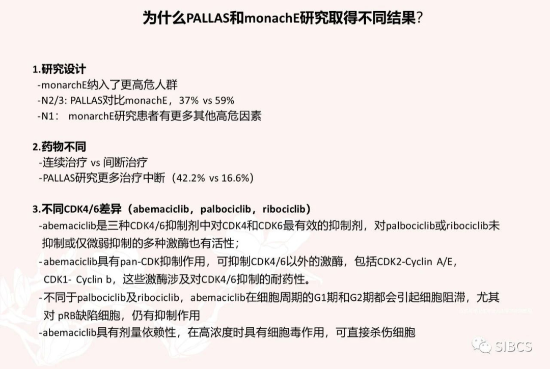 今年的ESMO大会报道了辅助治疗领域的PALLAS和monarch E研究,两项研究有一定的一致性,均探索了CDK4/6抑制剂在早期HR+/HER2-乳腺癌患者辅助治疗中的疗效和安全性。PALLAS研究应用palbociclib,得到的是阴性结果,而monarch E研究应用abemaciclib得到了阳性结果。为什么相似的试验设计却得出不同的试验结果呢?
