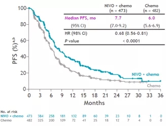 图1. 相比化疗,纳武利尤单抗联合化疗OS更优(左侧)、PFS获益(右侧)更显著