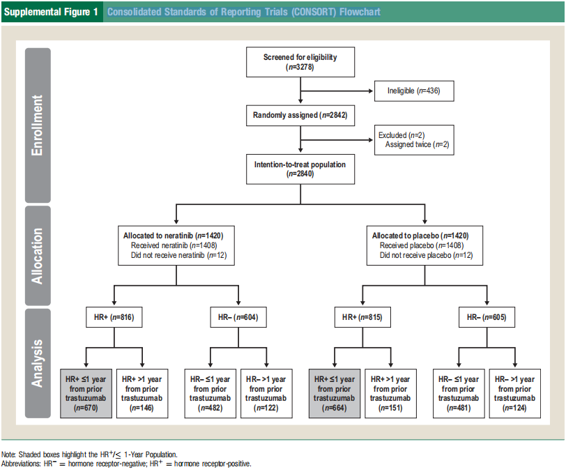在HR+乳腺癌患者中,有1334例(82%)患者在曲妥珠单抗应用1年内(HR+/≤1年)开始延长辅助治疗(奈拉替尼组,n=670;安慰剂组,n=664)。在曲妥珠单抗应用1年以上(HR+/>1年)接受治疗的患者有297(18%)例(奈拉替尼组,n=146;安慰剂组,n=151)(见Supplemental Figure 1)。